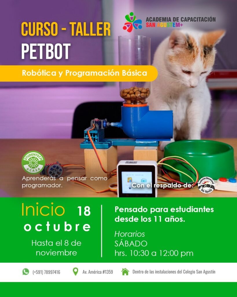 En nuestro Curso-Taller: PETBOT, aprenderás a construir, programar y personalizar un robot que se encargará de alimentar a tu amigo peludo.