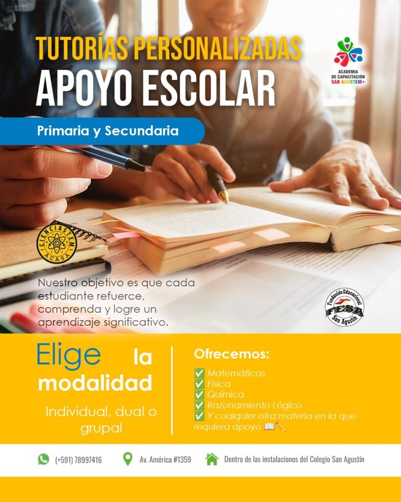 En la Academia de Capacitación San Agustem+, ofrecemos tutorías académicas personalizadas para estudiantes de primaria, secundaria y nivel universitario, enfocadas en la comprensión real de los contenidos y el progreso académico.
